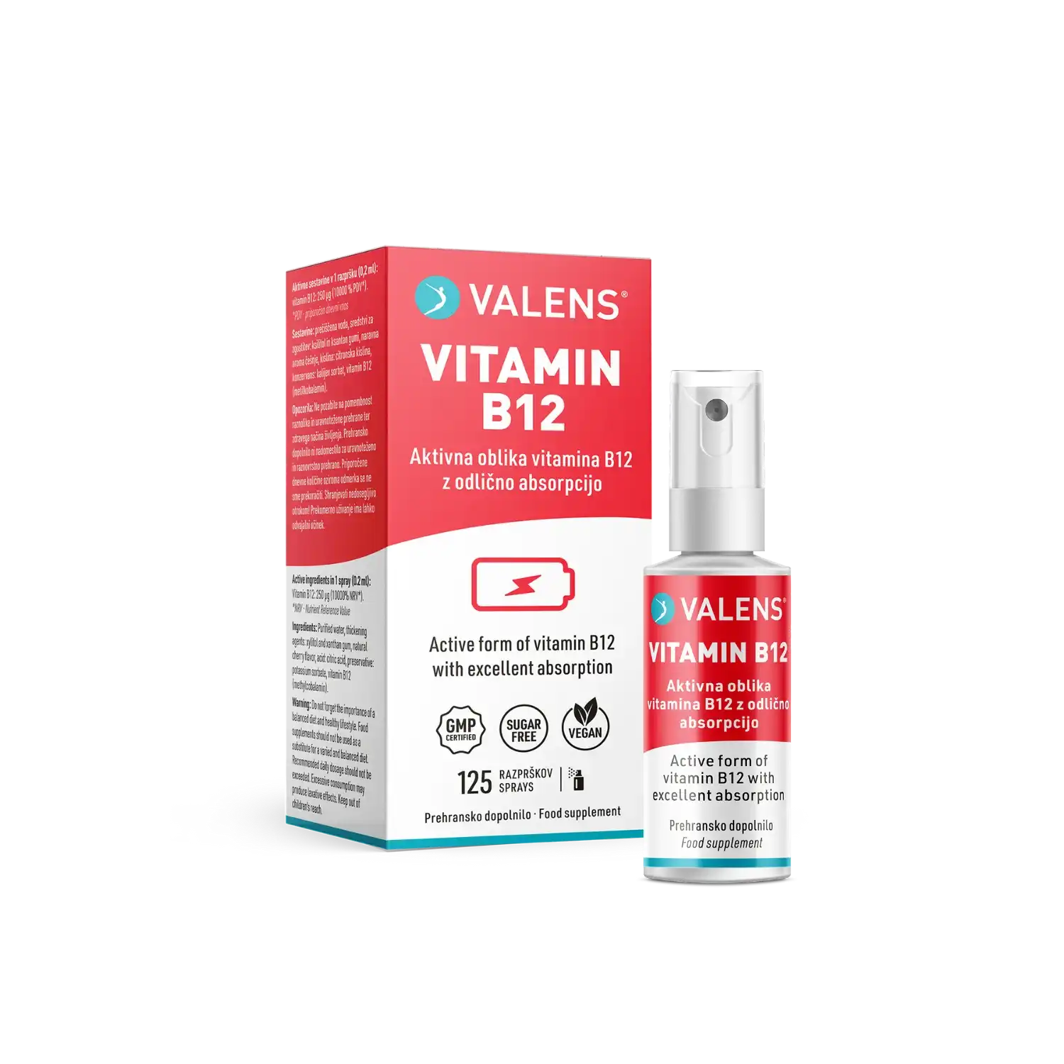 Valens B12 je inovativno prehransko dopolnilo v priročni obliki ustnega pršila z odličnim okusom češnje. Vitamini skupine B, med njimi tudi vitamin B12, so za naše telo zelo pomembni vitamini, saj igrajo pomembno vlogo pri ohranjanju zdravja in dobrega počutja. Ustno pršilo omogoča enostavno in natančno odmerjanje ter dobro absorpcijo, ki se prične že v ustni votlini. To je še posebej pomembno pri ljudeh, ki imajo oslabljeno absorpcijo v prebavnem traktu. Izdelek vsebuje metilkobalamin, naravno aktivno obliko vitamina B12. Vitamin B12 dobimo izključno s prehrano, večinoma se nahaja v izdelkih živalskega izvora in fermentiranih živilih. Pomanjkanje je zato še posebej pogosto pri vegetarijancih in veganih ter starejših osebah.