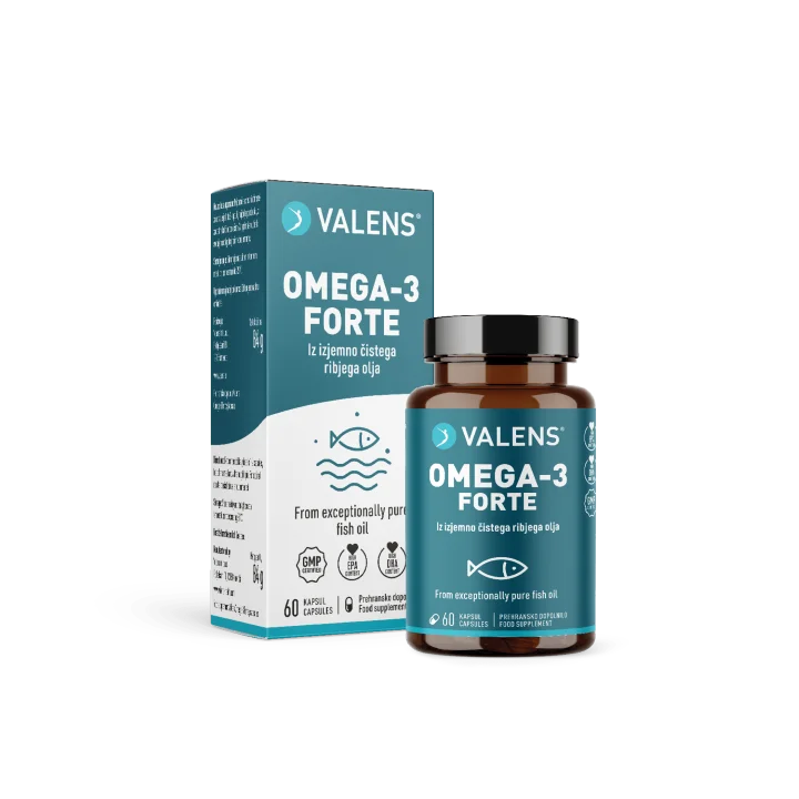 Valens Omega-3 Forte je inovativno prehransko dopolnilo v obliki kapsul, ki vsebuje visoke vrednosti nenasičenih omega-3 maščobnih kislin iz najkakovostnejšega ribjega olja. Ena kapsula vsebuje 1000 mg najčistejšega in najkakovostnejšega ribjega olja s kar 80 % omega-3 maščobnih kislin, od katerih prevladujeta eikozapentaenojska kislina (EPK) in dokozaheksaenojska kislina (DHK).
